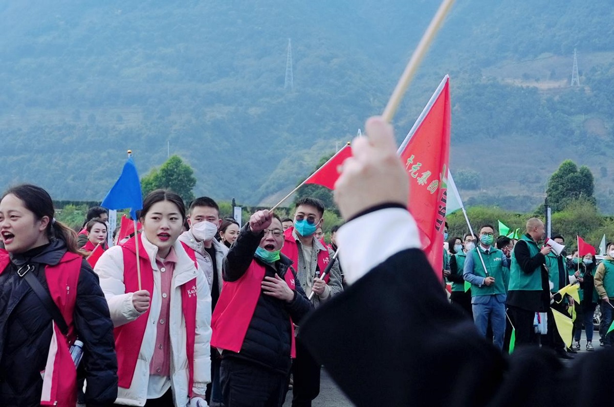 新年徒步活動于海花溝溝口出發,200余人的徒步隊伍彩旗招展,整裝待發。